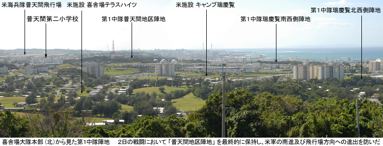 4月1日に嘉手納海岸・桑江付近に上陸した米陸軍第96師団は、停滞することなく南下を開始し、現在の普天間の西側(北谷〜普天間)を第383連隊が、東側(普天間〜中城)を第381連隊が担任した。 一方日本軍は、独立歩兵第12大隊(賀谷支隊)のみが米軍の上陸海岸から単独で戦闘を行い、特に普天間第二小学校の北側にあるキャンプ瑞慶覧付近に独立歩兵第12大隊第1中隊が陣地を構築して米軍の進出を阻止した。 4月3日にはこの陣地一帯に米軍が殺到し、第1中隊は昼間離脱をもって普天間の南側、野嵩陣地に後退した。 この後退により普天間第二小学校付近には日本軍が配置されておらず(次の日本軍陣地は大山・神山にあった)、したがって4月4日に米軍は一気に現在の普天間飛行場中央部(当時は現在の海兵隊格納庫付近に「神山集落」があった)まで進出した。