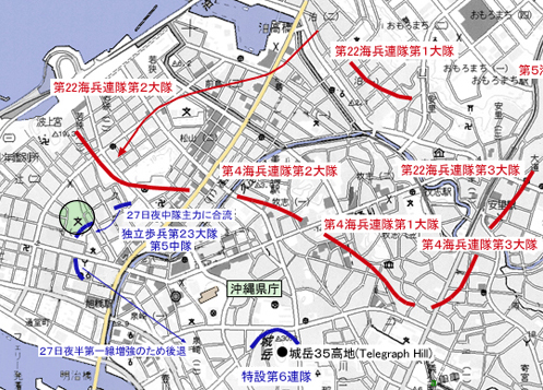 5月27日夜、独立歩兵第23大隊第5中隊は、一部戦線を縮小し、天妃小学校に主力を置き、翌日の米軍攻撃に備えている。 5月28日には米軍の攻撃が活発化し、圧倒的な戦力差のもと、日本軍は現在の泉橋付近で久茂地川運河を渡り、更に28日夜には、特設第6連隊の守備する城岳35高地に後退した。