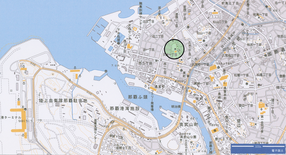 対する日本軍は、米軍の久茂地川運河渡河を妨害する任務(推定)を有した独立歩兵第23大隊第5中隊が配置されていたが、この地区に地形を利用した陣地構築は不可能で、おそらくは焼失を免れた建築物などから米軍を狙撃したと思われる。