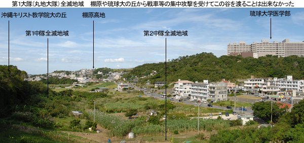 沖縄キリスト教学院大学・短期大学と琉球大学医学部の間には県道29号線が走る谷がある(写真右)。 沖縄キリスト教学院大学・短期大学の丘を越えてこの谷に侵入した将兵は、棚原高地や琉球大学医学部にあった米軍から、小銃・機関銃射撃・戦車砲・迫撃砲射撃を受けて、ことごとく倒された。