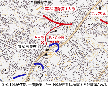 米軍は4月6日には、現在の沖縄国際大学付近の日本軍陣地を突破し、7日には志真志小学校北側に位置した。 4月10日、米軍は行動を開始し、第382連隊第1大隊が志真志小学校付近の攻撃を担任した。