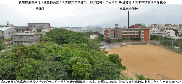 志真志小学校の南側は約20mの高低差のある高台になっている(写真右下)が、この台地を日本軍は「我如古東側高地」と称し、米軍は周囲に多数の墓があったことから「墓石高地」(Tombstone Ridge)と称した。