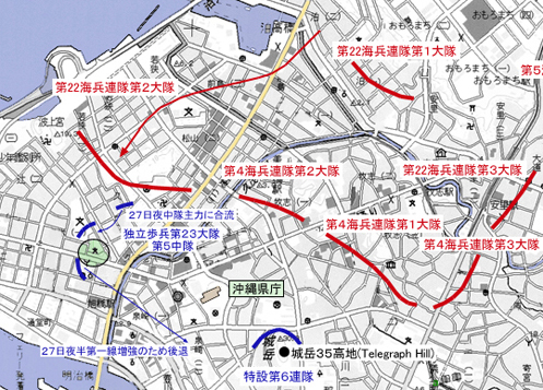 5月27日夜、独立歩兵第23大隊第5中隊は、一部戦線を縮小し、天妃小学校に主力を置き、翌日の米軍攻撃に備えている。 5月28日には米軍の攻撃が活発化し、圧倒的な戦力差のもと、日本軍は現在の泉橋付近で久茂地川運河を渡り、更に28日夜には、特設第6連隊の守備する城岳35高地に後退した。