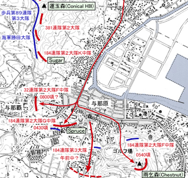 この重要な地形を確保したことにより、日本軍の中核である首里司令部は、那覇市及び与那原町の両翼から一気に包囲殲滅される可能性が高まった。 その意味でこの 「Spruce