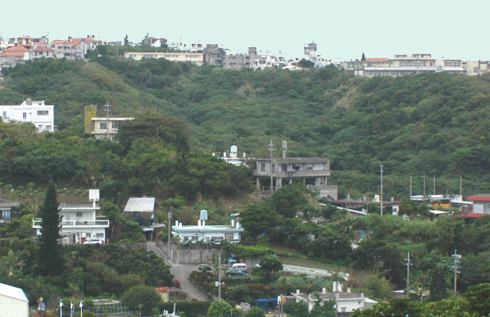 | 昭和20年5月6日から第1海兵師団第5海兵連隊は安波茶と沢岻の間、小湾川の流れる渓谷地域で日本軍の激しい抵抗に遭遇した。海兵隊はこの小湾川流域一帯地域を「安波茶ポケット」(Awacha-pocket)と称し、5月12日に制するまで多数の死傷者を生じている。写真を見てもわかるように複雑かつ急峻な地形のため戦車と歩兵の協同・連携が非常に取りにくく、戦車などは一度渓谷に降りてしまうと歩兵部隊の位置を見失ったり、位置を確認してもその場所にたどり着く道を探し得なかったりしたために歩兵だけで攻撃を開始して大きな損害を出す結果となった。また写真に見える稜線上は海兵隊の担任地域ではなく、米陸軍第77師団の担任する地域であったために、その背後や側面から攻撃することが困難であったために待ち構える日本軍陣地に対して正面攻撃を挑むこととなった。対する日本軍は独立歩兵第23大隊・独立機関銃第14大隊などが稜線上や崖に巧みに陣地を構築し、小湾川を渡ってくる米軍を的確に射撃、数次にわたる米軍の攻撃をその度に撃退している。 現在は深い緑に被われて、戦時下のような荒々しい岩はほとんど確認できないが、急峻な地形からか今でも開発の手を拒んでいるようだ。 |