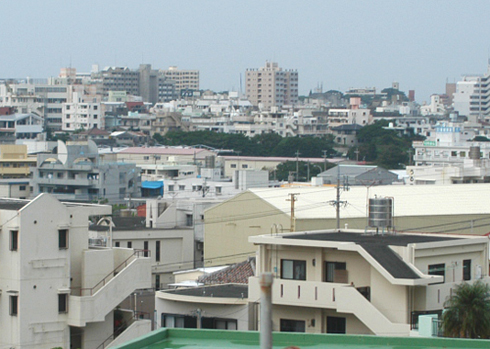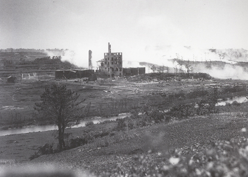| 戦前から安謝地区にあったブタノール工場が戦火に曝されて破壊されたもので、砲撃を受けている状況から考えて昭和20年5月9日ではないかと考えられる。ブタノール工場は現在の写真では中央部の赤い屋根の平屋工場、現在のサントリーの工場の位置となる。写真中央部に樹木が見えるが、その景観は戦時下の写真でも確認できる。これは当時の安謝集落北側にあった高地で、米軍は「チャーリーヒル」と呼称した。 5月10日朝から第22海兵連隊第1大隊C中隊が攻撃を担当したが、日本軍(独立第2大隊・機関砲第103大隊)は巧妙に偽装したトーチカとトンネル陣地で米軍を翻弄、C中隊は256名中戦死35名、負傷者68名の損害を出して12日朝(頂上部占位は11日16時15分)にようやく占領することが出来た。5月になって比較的順調に推移した北部戦線(名護地区)からこの南部戦線に投入された第22海兵連隊(第6海兵師団)にとって、この戦闘は日本軍の頑強さを敢えて知らされる戦いとなった。海兵隊の歴史書では「チャーリーヒルの試練」として記述されている。 現在は工場や住宅地に変貌しているが、「チャーリーヒル」は依然として周囲より20〜30m程高くなった丘として残されている。最後まで熾烈な戦いが続いた頂上部にはマンションが建ち激戦の面影はない。 本編 「安謝川渡河と天久台の戦闘」 を参照 |
