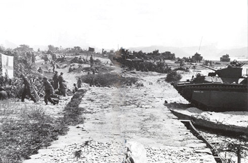 | 昭和20年3月26日午前8時4分にアメリカ陸軍第77師団第305歩兵連隊第3大隊が阿嘉島に上陸を開始したことにより沖縄戦が開始された。阿嘉島には海上挺進第2戦隊第2中隊・第3中隊が配備されていたが、上陸前にすでに大半の舟艇が破壊されており、さらに時機を失して出撃は出来なかった(一部出撃)。米軍の上陸時には両中隊とも島の東部にあった舟艇壕付近に集結をしたため、実質上この海岸でアメリカ軍の上陸を阻止する戦闘は実施されていない。写真を見る限り、すでに後続に上陸場所を示す布板(中央左)などが設定されていることから第2波以降の上陸であると思われ、日本軍の抵抗がほとんどないことから米兵にも安堵の雰囲気が見受けられる。 現在の写真には右奥に慶留間島に渡る橋が架けられてはいるが、戦時の様相はほとんど変化していない。美しい海に囲まれた島は本土資本のリゾート施設の建設や土地の販売を制限しているために、現在も穏やかな島の景観が残されている。 |