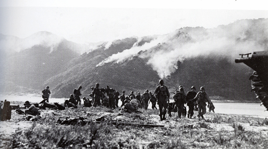 ![]() 海を挟んだ正面は慶留間島であり、砲弾の落下状況などから上陸当日、すなわち昭和20年3月26日であると思われる。慶留間島には海上挺進第2戦隊第1中隊が配置されており、その壕や舟艇壕は写真の左奥の谷間になる。第1中隊は最終的には一部住民とともにその谷間に追い込まれほぼ全滅したと言われており、おそらく戦時下の写真が撮られたその瞬間にはまだ生存者がいたのであろう。しかしながら重火器も持たず、海を隔てた阿嘉島に上陸する米軍に為す術はなかったのではないだろうか。 現在の写真は阿嘉島のフェリーターミナルである。このターミナルは埋め立てにより建設されたもので、戦時下の海岸線は現在の写真の駐車場付近であり、その場所に米兵が立っていることになる。駐車場の同じ撮影ポイントから撮影すると、橋及び公園の木々が画角に入って慶留間島の稜線がわからなくなるために一段高い後方から撮影した。 |