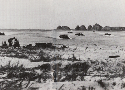 | 昭和20年3月26日、米軍の阿嘉島上陸時の写真である。撮影場所は阿嘉島そのものからのものであり、手前に既に上陸を果たした兵士が見えることから、第2波以降の上陸だと思われる。写真の右に阿嘉集落があり、上陸用装軌艇(水陸両用戦車)がその海岸に向かっていることがわかる。 上陸用装軌艇は米軍の上陸時に至るところで見ることが出来る。沖縄では改良の加えられたVT−A型が使用され、このタイプはそれまでの教訓を生かして、海岸の沖合にある珊瑚礁(リーフ)を乗り越えて進撃できるように開発されたものであった。主要装備は75ミリ榴弾砲であり戦車の主砲には劣るものの、日本軍の速射砲(対戦車火器)でなければ撃破出来なかった。そのため本来の戦車ではないにもかかわらず、日本軍の間では「戦車」として呼称されて記録されることも多かった。この阿嘉島においても日本軍の記録に「戦車が上陸してきた」とあるがその正体はこの上陸用装軌艇であった。 現在上陸海岸は東側の3分の1程度が埋め立てられ、フェリーターミナルや港湾施設となっているが、上陸時の面影は尚も濃く残されている。 |