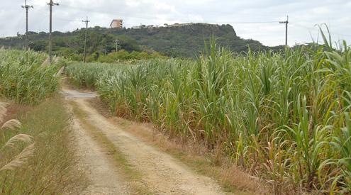 「石彫大獅子」 のある富盛地区 (「富盛の石彫大獅子」参照) であり、6月11日には日米両軍がこの両方の地形を占領して対峙した。この地区の日本軍は当初南部の港川地区に米軍が上陸することを想定して陣地を構築したために、北から進撃してきた米軍に対しては陣地の大半が役に立たなかった。この八重瀬岳も同様で、写真に見える北斜面の裾野に野戦病院壕などの後方支援施設を構築していたたがために、米軍との戦闘においては急遽構築した陣地で対応せねばならず、その防御力は地形に頼る以外にない状態であった。 この八重瀬岳は天然の要害ではあったが、台上に水がないという理由で当初守備部隊は麓に部隊を配備したが、沖縄第32軍高級参謀八原大佐がこの処置に激怒して陣地配備を変更させたという経緯がある。 当時の写真の撮影場所は、現在の写真の撮影場所の10mほど後ろであろうと思われるが、さとうきび畑が生い茂り、その場所からの撮影が不可能であったためにポイントを若干ずらしている。当時も今もほとんど変わらぬ風景である。また八重瀬岳上に見える建物は陸上自衛隊与座分屯地の隊舎である。 |