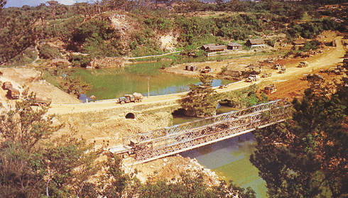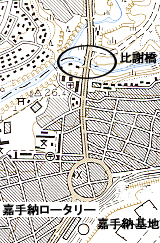 国道58号線の比謝川に架かる橋梁である。この地域は昭和20年4月1日の米軍上陸とほぼ同時に占領されている。戦時下の写真左側を見ると、道路が川を渡った後に右折している状況が見られる。現在では道路は曲がることなく真っ直ぐに進んで嘉手納ロータリーに突き当たっているが、戦前は岩山がそびえ立ち、それを迂回するために右折しているのである。米軍はこの道路を真っ直ぐにする工事に早い段階で着手しているが、手前に見える仮設橋が架けられたのは6月初旬である。まだ沖縄戦が行われていた段階であるとすれば、交通の要衝であるにもかかわらず対空処置がなされていないため、すでに日本軍の航空攻撃の脅威はないと判断しているのであろう。戦後捕虜となりこの場所を通ったある日本兵の手記によると、「日本軍の土木技術では削岩できなかった岩山を、米軍が簡単に削岩して直線の道路を建設している様子を見て、その圧倒的な機械力の差を痛感した」とある。 現在では道路の幅こそ広くなったが、概ねこの周辺の地形は戦時のままである。近年、嘉手納のシンボルであった嘉手納ロータリーも近代化されており、着実に開発の波は押し寄せている。 左の地図は戦前のものと現在のものを同じ尺度で表示している。比謝川南岸の道路が大きく迂回しているのがわかる。 |