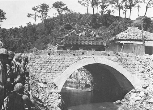 前出の「比謝北橋1」「比謝北橋2」と同じ場所の写真で撮影場所を変えたもの。兵士の装具などから「比謝北橋2」とはほぼ同じ時間に撮影したものと思われる。「比謝北橋2」で先頭から2番目に映っている兵士が、この「比謝北橋3」で一番左に写っている兵士に酷似しており、その点を考えると、橋の袂で休憩している兵士達が、休憩を終えて内陸部へ移動を開始したのが「比謝北橋2」ではないかと考えられる。