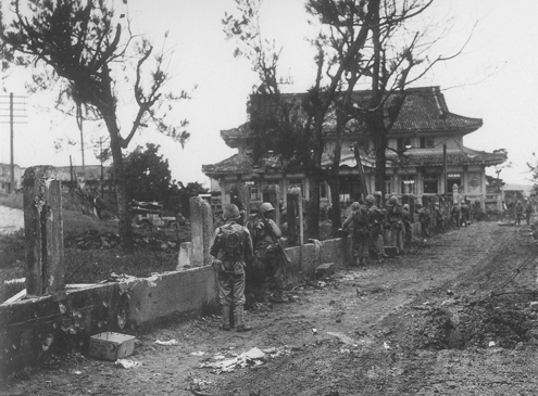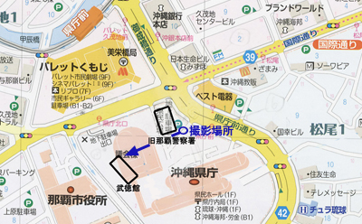 ![]() 武徳殿は1935年に武術の総本山として建設された。当時では珍しいコンクリート造りの構造で沖縄戦の戦禍にもその基本部分は耐え抜くことが出来た。戦後は改修されて警察の体育館として使用されたが、老朽化のため1989年には解体された。その歴史的価値から保存する動きもあったが、結局移築不可能ということで見送られている。その跡地は現在沖縄県議会棟となっている。 写真は第22海兵連隊第1大隊ではないかと推察され、完全武装の状況から昭和20年5月29日か30日が撮影日であると思われる。第1大隊はこの後、この武徳殿を大隊指揮所として南東にある城岳(日本軍呼称名35高地 : 米軍呼称名称テレグラフヒル)に向かい、ここで那覇市で最大の抵抗を受けることになる。 現在の写真の左端に写っているのが沖縄県庁で、撮影位置は米軍の航空偵察写真や米軍が戦後作成した地図などから全く同じ場所である。撮影場所の右手には当時那覇警察署があったが、この建物も一部を残すだけで破壊されている。 |