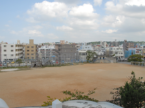 | ハーフムーンヒル(真嘉比南側高地)とシュガーローフ(安里52高地)は首里西方戦線における最大の激戦であった。特にシュガーローフが米軍に確保された後も、このハーフムーンヒルの反対斜面は日本軍が頑強に抵抗し、結果として米軍は直接首里に進出する計画を捨て、首里の南側から日本軍を挟撃する方策を取らざるを得なかった。 シュガーローフとハーフムーンとも戦後は那覇市郊外にあったため長く地形が残されていたが、このハーフムーンヒルは平成11年にこの地区の再開発によってほぼ完全に姿を消した。 造成前に遺骨収集が行われ、銃を握りしめた日本兵など多数の遺骨が収集されたのが唯一の救いであった。 撮影場所はハーフムーンヒルの頂上部からであるが、現存したときも頂上部北側にあった真嘉比小学校校舎によって北側の視界が遮られていた。 したがってこの写真は真嘉比小学校のテラスから撮影させていただいた。 撮影方向は当時の写真と同じである。 草木もない荒涼とした台地から戦闘の激しさが覗える。 当時の写真中央下部に現在の真嘉比小学校が建てられている。 |