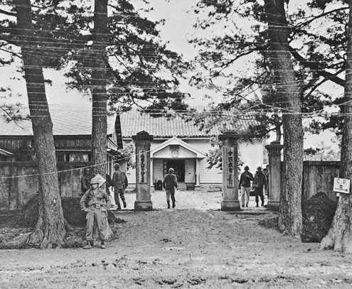 | 中城教育会館は普天間宮門前に発展した普天間集落の一角に位置した。普天間付近は上陸海岸から離隔していたことや、日本軍がこの地区を賀谷支隊 (「賀谷支隊の戦闘」参照) に遅滞戦闘 (敵の進撃を妨害しつつ後退する戦闘) を命じたために大規模な戦闘が行われなかったこともあり、比較的破壊を免れることが出来た。 米軍はこの地区を1日で通り過ぎて戦線を拡張したために、地区担当の第96師団司令部もこれに伴って上陸海岸にあった指揮所を、ここ普天間に前進させている。記録から推定すると上陸直後の4月上旬から5月中旬頃までここに指揮所(CP)を置いたようであり、当時の写真ではすでに緊迫した戦闘の様相は感じられないので、おそらく時期的には遅い段階であると推察できる。 現在、この場所は普天間高校となっている。写真に見える松林は普天間から宜野湾市我如古に続く見事なものであったと伝えられ、戦果を免れて戦後も残されていたが、その後松食い虫の被害にあって全てが伐採され現在は見ることはできない。尚、中城教育会館の実際の入口はこの写真の右手約20mのところである。 |