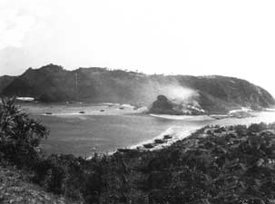 | 写真は慶留間島における米陸軍第77師団第306連隊第1大隊による上陸時の様子である。当初この写真は第1波の上陸シーンかと考えていたのだが、手前の外地島にはすでに水陸両用戦車が上陸を果たしている。記録によれば慶留間島には8時25分、外地島には9時21分が上陸第1波の時間であり、慶留間島上陸は外地島上陸の約1時間前に果たされているのである。したがって、この写真は昭和20年3月26日9時21分以降のものとなり、慶留間島へ向かっている舟艇は後続部隊(記録では第304・305砲兵大隊が上陸している)の上陸ということになる。 戦時下の写真の撮影ポイントは、現在の撮影ポイントから100m程右前方であると思われるが、外地島は人家等がなく全域が樹木に被われており、どうしてもそのポイントにたどり着くことができなかった。よって外地島展望台からの撮影となっている。 |