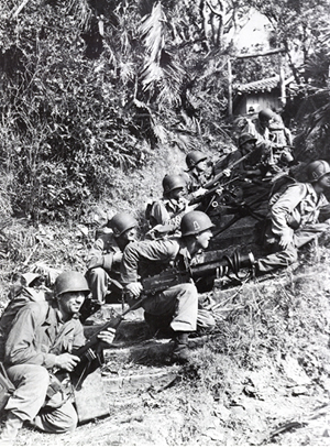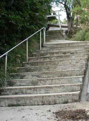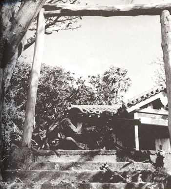 | 昭和20年3月26日午前8時25分、米陸軍第77師団第306歩兵連隊第1大隊が慶留間島に上陸を開始。日本軍は海上挺進第2戦隊第1中隊基幹が配備されているだけであったため、ほとんど抵抗を受けることなく上陸に成功している。この写真にある神社は上陸海岸から約250m離れた場所にあり、実際に徒歩であれば5分程度で到着できる。当時抵抗は少なかったとはいえ、警戒を実施しつつ前進するためにその何倍も時間を要したであろうが、いづれにしても上陸からそう時間が経過しているとは思われない。兵士の影から判断しても朝方であることは間違いない。米軍は上陸後概ね二手に分かれ、一方は島の中央部の山岳地域を目指し、もう一方は海岸線をこの神社の方へ進撃した。この場所は東海岸線を見通す為には格好の場所であったのかもしれない。ただし現在この場所に立ってみると樹木が多くて遠望は効かない。 この写真については多くの資料で「渡嘉敷島」との説明がなされているが、見てわかるとおり間違いなく「慶留間島」である。付け加えるならば、この写真は構図などがあまりに整っている感があり、日本軍の抵抗が少なく緊張感が解けた際にカメラマンの注文に応じて撮影されたもののような気がしてならない。 |