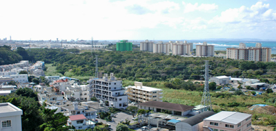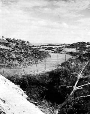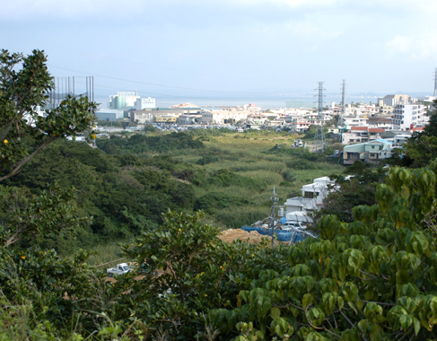 城間地区(米軍作戦地名:アイテム)は日本軍独立歩兵第21大隊と米陸軍第165連隊が戦闘を交えた地区である。写真は最も激しい戦闘が行われたアイテムポケット(強力な機関銃拠点があった)の北側にあたる場所であり、米軍は写真の右側である牧港地区から中央の平地部の海岸線付近を横断して進撃した。日本軍はこの地区の陣地を海から上陸する敵に対して構築していたため、米軍は正にその正面から攻撃することになった。昭和20年4月20日に半日で突破できると見積もった米軍は苦戦に陥り、アイテムポケットを占領したのは4月27日であった。 この城間地区は市街地化から逃れるとともに、米軍の牧港補給基地があるために皮肉な事ながら開発が進まずに当時の戦場がほぼそのまま現存する貴重な地区となっている。しかしながら、平成14年以降はアメリカ兵の血で赤く染まったというこの中央部湿地帯には住宅地が建設され始め、平成21年完成予定でこの地区にバイパスが建設されることから全ての戦場は姿を消す運命にある。また米軍基地も返還されることから基地内にある戦跡も恐らくは大半が失われることになると思われる。 本編 「城間の戦闘」 を参照 |