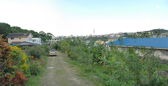 がおそらく弁ヶ岳であろうという推測から、中央部の高い山は、首里と石嶺の間にある150数メートルの山ではないかと思われた。 しかもその山は地図上から頂上部が崖のように急峻であることから中央の写真と一致する。 この150数メートルの山は戦後削り取られ、今ではNTTの電波塔が建設され、山そのものの標高も110m程度となった。 当時の写真と現在の写真は画角が一致しないが、 現在の写真の左端に見えるピンク色の家の位置に、当時の写真の右側にある焼けた1本の木があるとすれば、構図的に成り立つようだ。したがって、当時撮影した場所は車の位置から左へ約50mほどの地点かと思われる。 なお、この付近の住民の方の話によれば、戦後収容されず野ざらしの日本兵の遺体があたり一面に散乱していたという。 また現在でも付近の小川などからは、日米両軍の小銃弾や砲弾が掘り出されている。 戦争の影は今もこの地に残されているのである。 |