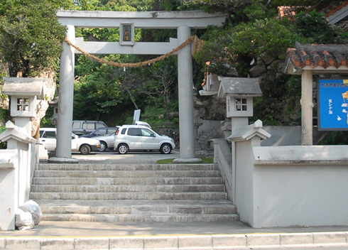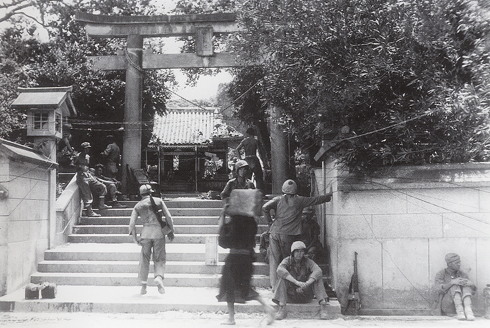 | 糸満市北端にある白銀堂地区では、昭和20年6月9日から10日にかけて米第1海兵師団第7海兵連隊第2大隊と日本軍第24師団第32連隊第1大隊第3中隊の一部(大隊長の記憶ではこの白銀堂付近に兵力を配置した記憶はないということから推測の域を出ないが)が報得川を挟んで戦闘を実施、米軍は日本軍の激しい抵抗で9日には報得川を渡河できず、10日に水陸両用戦車を使用して海岸側から攻撃して占領している。しかしながら、写真からは戦闘中や直後の緊張感が伝わって来ないし、民間人が荷物を担いで歩いている状況からして、戦闘終了からかなり時間が経過した頃の写真であろうと思われる。 写真からもわかるように、白銀堂は戦時下の様相がそのまま残されている。白銀堂の裏手に上記の日本軍陣地があったのだが、神社自体に大きな戦闘の爪痕は残されていない。現在は鳥居奥にあった本堂は写真の右手に移されてはいるが、その他は概ね元の位置のままである。ちなみに手前は那覇市と結ばれている国道331号線であり、車の騒音さえなければ当時の雰囲気が伝わってくるようであった。 |