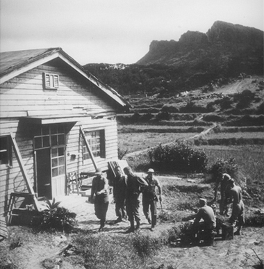 (米軍は奄美などからの逆上陸を警戒していた) 警戒やゲリラ部隊の掃討という目的しかなかったものと思われる。 写真の辺土の米軍施設については、辺土集落で記憶があるという人が数名おられた。人によっては通信施設だったという証言もあったが、確かなことは調査資料でも不明であった。ある女性は初めて見るアメリカ人がとても大きくて怖かったということであったが、特に地元住民に危害を加えることもなかったという。 写真の場所は地元の人の証言で細部位置まで判明した。その位置は現在の写真の撮影場所の約40m右方であったが、さとうきびが生い茂りその場所にたどり着くのが困難であったことと、地元の方からハブの冬眠前の活動期であり、「必ずいる」という助言にあえなく断念した。 |
