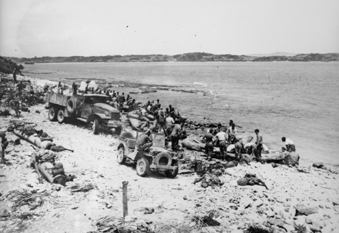 4月7日0015、一番北の伊計島から上陸を開始し、続いて宮城島・平安座島へと上陸を果たしたが、日本兵の姿も、軍の施設もなくわずかな住民だけを確認している。 続いて浜比嘉島への上陸を行うが、この時は理由は不明ながら手漕ぎのゴムボートでの上陸となった。 写真はその際の状況でゴムボートを準備しているところであるが、この場所は当初平安座島の上陸地点