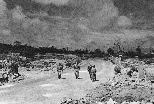 | 城岳(35高地)の戦闘は5月30日に終了した。 当時の写真はその兵士の様相から戦闘が終了してかなりの時間が経過したものだと思われる。兵士達が歩いている右後方に門柱が見えるが、この門柱は県立第2中学校の門柱であって、その位置は現在の那覇高校の校門と同じ位置となる。現在の写真で右に見える赤帯のバスが停止している手前がその校門の位置である。いくぶん道路の形状が異なって見えているが、米軍が終戦直後に作成した地図でも当時の写真と同じ曲り方であるので、その後道路が整備された時に現在のように改修されたものと思われる。 なお、写真の左手側に城岳(35高地)が位置するので、海兵隊はこの写真の右から左に向かって攻撃前進したことになる。 |