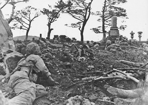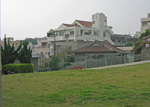 | 5月29日に第6海兵師団第22海兵連隊第1大隊が県庁付近を確保、その日のうちに城岳前面に進撃した。そして第29海兵連隊第1大隊とともに県庁から南東へ約500mの城岳35高地(米軍名テレグラムヒル)の攻撃に移行した。この城岳は電信塔がある高台で、那覇市全域や進撃方向の南東部に対して良好な視界を有していた。日本軍は那覇市内では有効な抵抗はできなかったが、特設第6連隊がこの城岳を占領して30日まで海兵隊の進撃を阻止した。 当時の写真の場所は県立第2中学校裏 (現在の那覇高校) から現在の松尾公園にあった「大和墓」付近から城岳(写真の左端に見える円形の丘)を攻撃しているものである。資料では6月1日の撮影とされているが、1日には戦線は識名高地付近にまで南東進しており、したがって撮影日は5月29日または30日となる。この大和墓は那覇高校の北側では住宅地となり全く姿を消しているが、松尾公園のみが当時の地形形状を残している。 当時の写真にうっすらと写っている鉄塔の位置や城岳の位置・形状からこの写真の撮影場所を現在の松尾公園としたが、鉄塔の細部位置が不明確なため、全く同じ撮影ポイントとは言い難く、さらに全般的な状況を撮影するために稜線上に出て撮影した。現在の写真では同じく左端に少しだけ城岳が見えている。 |