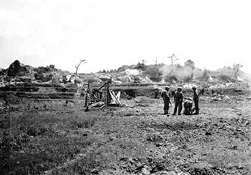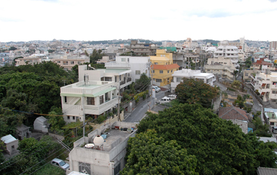 アメリカ軍の記録には「Hill 7574」と記されているだけであり、具体的な地名や名称はない。しかしながら米軍の作戦地図を見ると、沖縄本島を方眼で区切り、そのひとつひとつに番号が付されている。「7574」地区とは那覇市安謝地区のことであり、この方眼の中には顕著な高地はひとつしかない。それが写真の高地であり、米海兵隊はこの高地を「チャーリーヒル」と名付けていた。「チャーリーヒル」は米海兵隊第22連隊第1大隊C中隊が攻撃した高地である。5月10日早朝、C中隊は高地北側にある安謝川を渡り攻撃を開始したが、高地に張り巡らされた日本軍の洞窟陣地により、高地北側斜面に達しながらも背後から攻撃を受けて死傷者が続出した。11日になっても身動き出来ない状況であったが、16時過ぎにようやく戦車が到着して一気に高地頂上部を占領した。C中隊は総員256名で攻撃を開始したが、戦死35名・負傷者68名を出し、あまりに激しい戦闘から「チャーリーヒルの試練」と記録されることになった。だが、実際は翌12日も日本軍の逆襲などを受け、更に死傷者は増加している。 現在の写真はほぼ同じ場所から撮影しているが、再開発により近代的なマンションや住宅が林立し、ほとんど高地を望むことは出来なくなった。ピンク色の構造物の右手奥にコンクリートの建築物があるが、これが「チャーリーヒル」である。 また、右の写真はこの「チャーリーヒル」を近くのマンション屋上から撮影したものである。道の形状から高地であることがわかるが、僅かに残された樹木だけが昔高地であったことの名残となっている。 |