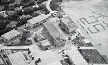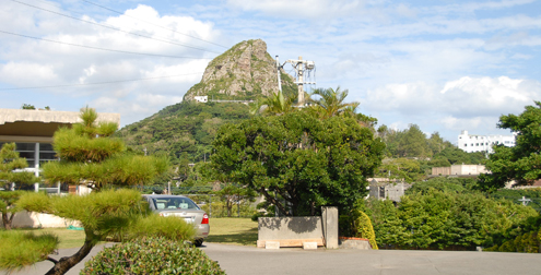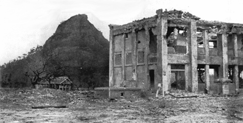 ridge」(血の稜線)と呼び、日米双方の激戦地となった。特にこの学校高地は米軍が占領した後に、再度日本軍が奪回するなど、米軍公刊戦史でも大きくページを割いているほどの激しい戦闘であった。当時からコンクリート製の校舎は、舎内に双方が機関銃を据えるなどしたために徹底的に砲火が浴びせられたが、写真のように何とか基礎的な部分が残された。この校舎は戦後に卒業生らが集まって改修し、しばらくの間実際に教育の場として使用されたそうである。右の写真が修復されて使用されていた頃の写真である。写真中央の屋上に小さな出っ張りのある校舎が戦火に曝されながらも残された学校高地の校舎である。当時のこの校舎は現存せず、新しい校舎がその場所に建っている。同じ場所からの撮影は新校舎があって不可能であったため、現在の写真は当時の校舎の左端にあたる部分から撮影した。 (右の写真及び校内からの写真撮影は伊江中学校の校長先生の許可を頂いて撮影しました。ご協力に感謝致します) |