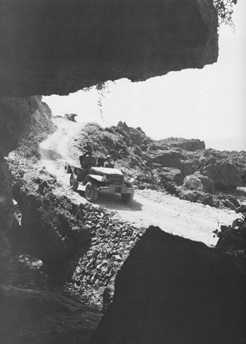 | 伊江島北部海岸にある湧出(ワジー)と呼ばれる島の水源地に降りる途中の場所である。ジープに乗る米軍の姿は完全武装ではないことから、戦後時間が経過してからの撮影であろう。伊江島は米軍が上陸した南海岸は砂浜が広がるが、それ以外は荒々しい岩壁が広がる。自然壕も多く、伊江島の戦闘終了後は多くの住民や日本兵がこれらの壕に逃げ込んだ。 伊江島は真水の湧く場所が限られており、現在もこの湧出からの水で上水を完備している。戦前からこの湧出の水をポンプで汲み上げて島内への給水を要望していたというがなかなか実現しなかった。しかしながら、米軍が伊江島を占領後にポンプが設置されて、長年の渇水から解放されたということである。 |