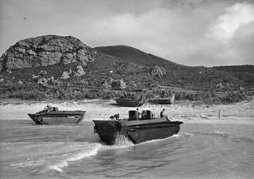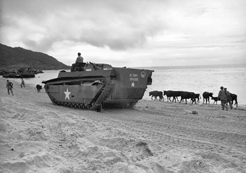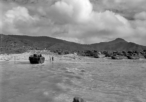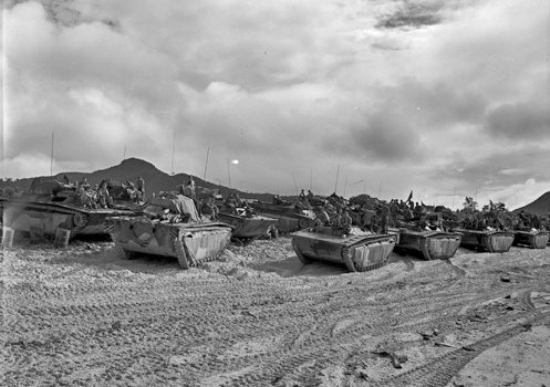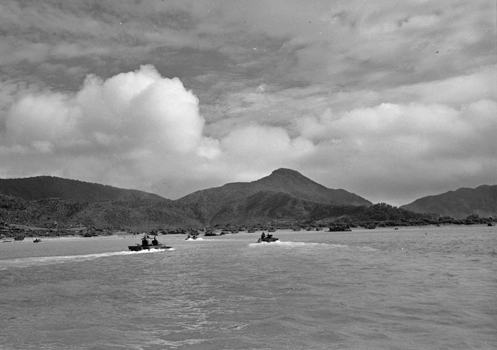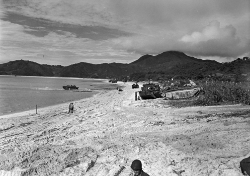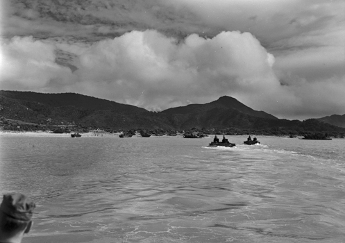 | 上陸海岸に関する写真の中で一番東側から撮影された一枚。 一番奥に見えるLVTが概ね現在のフェリーターミナル(茶色の屋根)付近にあることから、この範囲に上陸したものと考えられる。 | |
