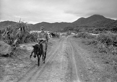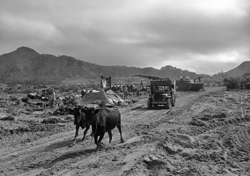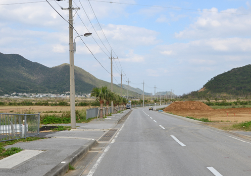 | 7月5日撮影とあるが、6月5日の誤りだと思われる。またキャプションに 「レッドビーチ裏手 前岳を望む」とあるが、前岳は全く逆の方向であり、見えている高い山は賀陽岳である。 このように米軍写真のキャプションには誤りが多く、研究調査には十分注意する必要がある。 当時の写真の道路左手は砂浜であり、この道路が海岸沿いを走る幹線道路であった。 | |