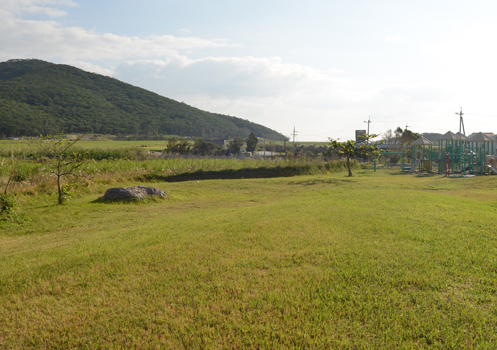 | 6月3日撮影。 伊平屋島のムーンライトマラソンのイラストが描かれたタンクの場所こそが最大の上陸点であった。 現在、上陸海岸はほとんどが埋め立てられているが、現在の写真で小舟の置かれている場所(草地)は緩やかな斜面になっており、これが当時の海岸の名残になっている。 小舟の位置には当時LVTが集中して停車していたことがわかる。 撮影位置は同じポイントである。 | |