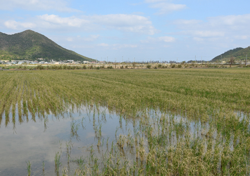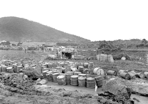 | 原野の中に積まれた配給用の食料と水。この集積所は前泊地区から田名集落に抜ける道の途中にあったもので、最後の特攻機として知られる中津留大尉率いる一群の磯村少尉・後藤上飛曹機が突入した近くにある。 | |