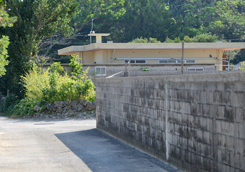 | 6月3日撮影。 「900m進んだが敵の攻撃はない。我喜屋集落に入る海兵隊」 というキャプチャーが付けられている。 撮影場所は我喜屋集落の北端であり、ここからフェリーターミナルまでは概ね900mであり、説明が一致する。 伊平屋島の写真には戦闘中の写真はほとんどなく、場所が特定できたのはこの一枚だけであった。 戦闘中と書いたものの、実際の戦闘はなかったため、進行方向 (塀に寄り添う姿勢から進撃方向は写真の左から右、すなわち我喜屋集落を北東から南西に進撃している) を索敵しながらの進撃場面と言ったほうが正確かもしれない。 写真では石積み塀の傍で待機しているが、現在では石積みの壁はほとんど見かけることはなく、大半はコンクリートブロックとなった。 撮影ポイントを探し出すのにかなりの時間を要した。 | |