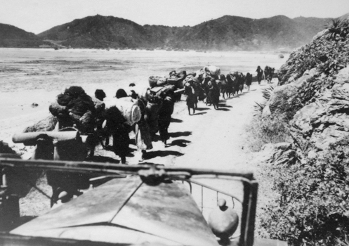| 6月7日撮影。 「海兵隊が我喜屋を占領したため、村を去る住民」 とのキャプチャーが付けられている。 我喜屋集落はこの道の奥にある。 撮影ポイントは同じであることから、当時の右の崖が削られて海側に造成された道路であることがわかる。 楽しげに歩く子供達が平和の尊さを教えてくれる。 | |