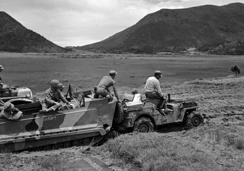 | 6月5日撮影の写真で、泥濘みからジープを押しだそうとしている水陸両用車とのキャプションが付けられている。 また前岳を望むという一文もあるが、見えているのは後岳である。 場所は田名集落の南西、田名池付近である。 | |