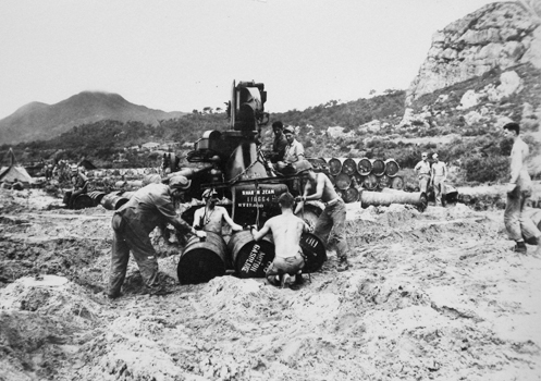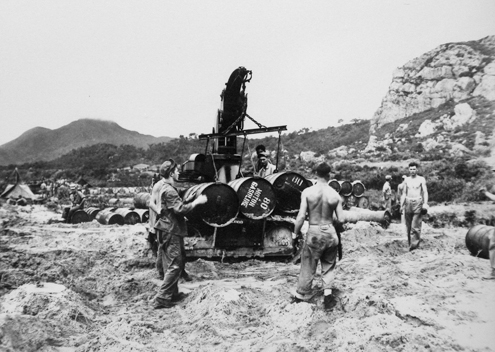 の写真と一致すると思われる。 ガソリンスタンドから手前は比較的広い平らな地形であったため、米軍は物資の揚陸後は直ちにこの場所に集積を行ったようである。 海岸線幹線道路1〜3は、保管されている場所がバラバラであるが、実は一連の写真である。 左上の写真奥に写っているアームのある重機は、実は他にも2枚の写真がある。 これが下段にある2枚の写真である。 したがって、カメラマンは北東から徒歩で南西に向かい、連続してこの5枚の写真を撮影したのである。 |