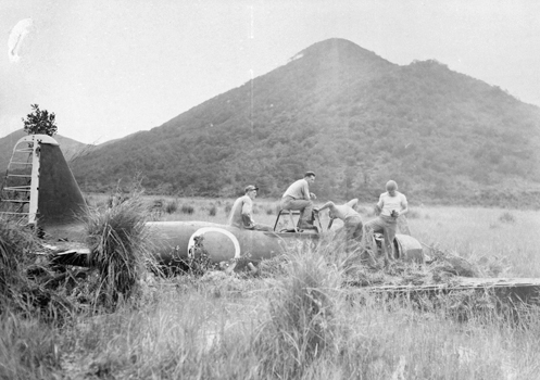 | 5月15日撮影とされる写真で、上陸した6月3日より以前ということで全く信憑性がない。 しかも「不時着した日本軍機とのスナップ写真1」で写っている人物と同一である。 実はこの比較写真の撮影位置は正確ではない。 この写真は機体の右後方から撮影しているが、その現在は全く立ち入ることの出来ない湿地帯で、仕方なく 「不時着した日本軍機とのスナップ写真1」の撮影位置から山並みが同じに見える方向へカメラを構えたものである。 | |