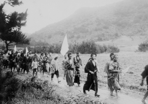 | 6月3日撮影。 「田名村の温和な民間人。進んで海兵隊に投降し、雨の中を3km歩いてきた」 とのキャプチャーが付けられている写真。 3kmという距離から現在の前泊地区の住民の方々と思われる。 撮影場所は現在の田名集落東端であるが、当時の道の取付を確認できず、背景から推定して撮影した。 | |