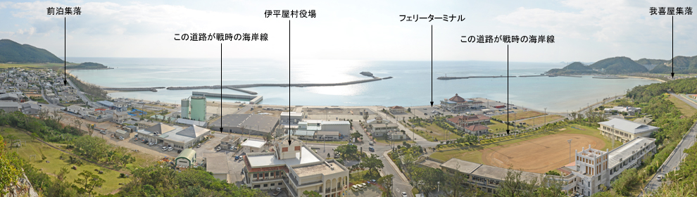 | 虎頭岩から見た米軍上陸海岸 : フェリーターミナル一帯は埋立地で、現在の幹線道路が戦時の海岸線に相当する。 米軍は前泊地区からフェリーターミナル付近に上陸を開始した | |