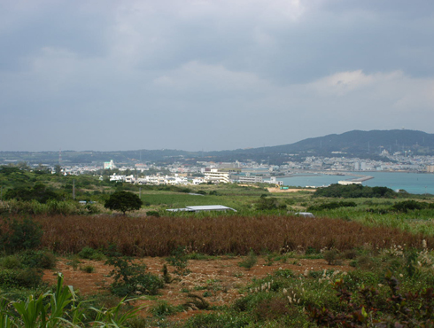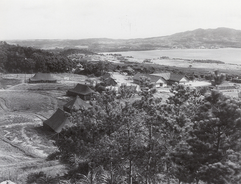 | この写真の撮影は昭和20年6月27日とあり、「石川の米軍政本部幕舎」とある。したがって沖縄戦の終結から数日を経過したものであり、戦時下の緊張感などから解放されている感じが写真からも受け取られる。戦後、石川地区は米軍の保養施設・病院などが建設されたが、何故この場所が軍政本部が選定されたのかは不明である。この地区は東恩納地区にあたり、米軍上陸の4月1日直後から北部へ転進する特設第1連隊他の諸隊が通過した場所であり、混乱した情報の中で米軍と接触して大きな犠牲者を出している。遠方に見える山が石川岳であり、将兵はまずこの山を目標としたという。現在この地区は農地となり、米軍の痕跡は跡形も残されていない。撮影ポイントは高台のようであるが、おそらくその場所と思われる地点は畜産業が営まれていたために、50mほど撮影ポイントをずらして遠方が見える場所から撮影した。中央の白いピニールハウス付近が元幕舎群の中央部であろうと思われる。 | |