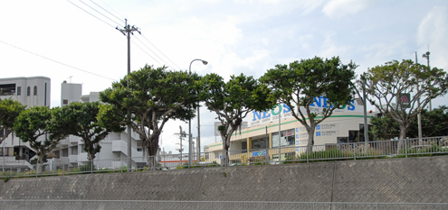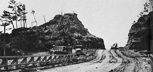 ![]() 牧港周辺は戦前には写真のような大きな岩礁が多く、主要な道路・軽便鉄道などはその地形を掘削するか迂回して構築された。写真は現在の国道58号線の一筋南側を走る旧道であるが、現在は橋もなく、地図からその道路の形状が確認できるだけである。戦時下に米軍は爆破された橋に代わって架橋を行い、更に道路を急速に拡張したが、前線への武器弾薬・食糧等の大量輸送には不十分と判断し更にこの場所のすぐ北側にもう一本車両用架橋を行っている。 しかしながら、この旧主要道は道幅も狭く拡張も困難であったために、米軍はこの橋の南側に新たに橋を建設して、主要幹線道路を新たに建設したのである。その道路は右の地図で「メディカルプラザ牧港」のところにある橋を渡る道路である。この道路が「R−1」と呼ばれて戦後沖縄の最大の幹線道路であった。 その後、この道路も手狭になったため、現在の国道58号線が新たに建設され、近年は高架となり付近の風景は一気に変貌した。 |