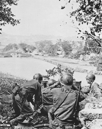 ![]() 4月1日に嘉手納正面に上陸以来、順調に進撃してきた米軍も4月8日に嘉数で大きな損害を受けて以来、全線で攻撃は膠着状態に陥った。打開策が見出せないままに時間が経過したが、各種偵察の結果から日本軍左翼(米軍右翼)の牧港付近の陣地配備が手薄であることを偵知、4月19日からこの牧港の牧港川を渡河して一気に伊祖高地に攻め入って嘉数・西原などを側面から包囲する方策を探った。一方日本軍は伊祖高地に重点的に陣地配備を行い、この牧港には何故か部隊を配備しなかった (後方1kmの29高地に独立歩兵第21大隊第1中隊を配備) ために米軍の架橋作業を妨害、破砕することが出来なかった。 当時の写真は牧港川にかかる橋の方向を掩護する状況であるが、日本軍により爆破された橋はすでに米軍によって応急的に架橋されているが2本目の車両用架橋がなされていないこと、米兵が完全武装であることなどから4月19日の撮影だと思われる。 この撮影場所はすでに宅地となっており撮影は不可能であったため、前に出て若干近い距離から撮影している。当時の写真に写っている橋 (牧港旧道橋を参照) は現在の写真では遥か奥になっており、手前に見える橋はその橋ではない。高架橋や手前の橋は、当時の写真ではちょうど写真の真ん中付近に位置する。 |