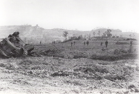 | 背後に見える前田高地は日米両軍にとって勝敗を決する重要な地形であった。米軍にとっては首里までが一望できる観測点を獲得し、戦車機動を遮る地形的障害を排除したことはこの後の戦闘を一気に有利にしたと言っても過言ではない。日本軍にとっては前田高地を失ったことで、敗戦という言葉が一気に身に迫ったに違いない。写真の場所は前田集落南部地区にある前田小学校グランドである。昭和20年5月4日に沖縄第32軍は大規模な攻勢を実施しているが、この失敗によって前田集落南部地区は諸隊が混淆し戦線が整理できない状況下、5月6日に米軍の攻撃を受けたのである。各部隊の指揮通信が混乱する中、部隊間に遺恨を残しながら(通信手段がないために隣接する部隊の撤退を「無断撤退」と受け取った)も激戦を耐え抜いたが5月9日には米軍の突破を許している。写真はその戦闘が終了して米軍が更に前進する際のものであり、5月10日前後ではないかと考えられる。 背後に見える尖った岩は為朝岩であり前田高地のシンボルでもあるが、この時期為朝岩周辺の壕にはなおも第32歩兵連隊第2大隊(志村大隊)が生存し絶望的な戦闘を継続している。写真の右奥にお椀を伏せたような高地があるが、これが130閉鎖曲線高地(米軍名150高地)であり、日本軍はこの丘を守備するために多大な犠牲を払い、別名「死の高地」と呼ばれた。この高地は現在の浦添市消防本部裏手にあたるが、造成されて墓地となり、その姿を残していない。 写真はほぼ同じアングルで撮影したが、実際はこの撮影場所の後方50mくらいになると思われる。その場所は現在民有地となり高低差もつけられていたために、グランドに降りて撮影した。おそらく米軍兵士の右から4人目くらいの位置に立っているものと推察している。 |