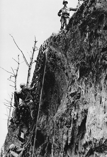 | 牧港〜嘉数〜西原〜千原〜和宇慶という日本軍第一線主陣地帯(実際は嘉数は本来の主陣地ではない)を失った後、前田高地は第二線陣地として中央部の最も緊要な地形であった。米軍は嘉数・西原の奪取後の4月25日から前田高地の攻略に着手、26日には早くも戦車が前田高地の背後に侵入して日本軍は苦戦に陥った。しかしながら、天然の要害である前田高地には独立歩兵第12大隊(賀谷大隊)や歩兵第32連隊第2大隊(志村大隊)等が立て籠もり、その奪取は容易ではなかった。 米軍は前田高地に立て籠もる日本軍に対して南北両面からの殲滅戦を行ったが、特にこの写真の北側斜面では這い上がってくる米軍に対して日本軍は手榴弾を上から投げつけるなどの抵抗を示したために作戦は進展せず、最終的に前田高地を押さえたのは5月9日夜に日本軍が前田高地から脱出してからとなった(実際は志村大隊が脱出できずに立て籠もっていた)。 写真は5月4日に撮影された米第307連隊の前田登坂とされる。この頃は日本軍は昼間に行動することはなかったため、比較的余裕をもっている米兵の姿である。この写真を一部資料では島尻半島南部の具志頭95高地としているものもあるが、上に立っている将校の名前も判明していることから誤りである。 現在の写真の下側には日本軍が構築した壕が見える。この壕を写真に入れるために、撮影ポイントを敢えて後ろに下げた。当時の写真で、ネットがかかっている上部の出っ張りが現在の写真でも確認できる。草が生えてよくわからないが、この付近一帯はほぼ垂直の絶壁である。 |