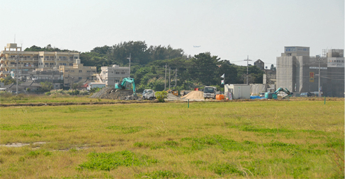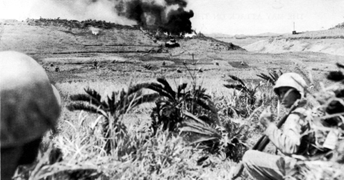 | 真嘉比南側高地(クレセントヒルは、沖縄戦最大の激戦地である安里52高地(シュガーローフ)の東側に連なる標高約45mの丘である。 写真のように前面に障害となる地形もなく、米軍側斜面は戦車の機動も可能なこの丘は、5月15日から31日 (日本軍撤退) まで実に17日間にわたる米軍の攻撃に耐えて日本軍が死守したのである。 当時の写真で黒煙を上げる丘が真嘉比南側高地(クレセントヒル)で、その右側の谷を挟んで少し盛り上がって見える丘が安里52高地(シュガーローフ)の東端である。 この地区を担任したのは米海兵隊第6海兵師団第29海兵連隊で、日本軍の射撃を避ける障害物のない平地からの攻撃を避け、両高地の間の谷間(隘路)から幾度となく攻撃を仕掛けた。 しかし、日本軍もその企図をあらかじめ見抜いて火力を集中させていたために、米軍の損害は増大する一方であった。 写真はそのような攻撃の一場面であるが、戦車が丘の西端に進出していることから、5月16日の攻撃であると推定できる。 5月16日は米軍側の記述によれば、米軍側の死傷者数がおそらく日本軍を上回ったという 「沖縄戦最悪の日」 であると位置づけられているが、このクレセントヒルでも第29海兵連隊第1大隊・第3大隊が、戦車を先頭に中央右の谷間(隘路)を通過して攻撃を行った。 写真手前の兵士は位置関係から第29海兵連隊第1大隊C中隊で、その奥に小さく数名の兵士が写っているのがA中隊となる。 尚、戦車部隊が谷間を通過したのが14時で、その後続に第3大隊G中隊・I中隊が進出を図っているが、この写真はまさにその時間帯のものであると思われる。(戦車部隊等の進出部隊は夕刻にすべて撤退)。 この地区一帯は再開発のために造成工事が進行中である。 C中隊が日本軍の夜襲に怯えて掩体を掘った小さな丘(写真の兵士のいる場所)はすでになく、ハーフムーンもやがて姿を消すことになっている。 現在の写真でも造成工事が確認できるが、この地区からは多くの遺骨・遺品が掘り出され、当時の戦闘の激しさが理解できる。 写真右端の「シュガーローフ」側はすでに再開発が終了し、当時の写真にある谷間には現在モノレールが走っている。 参考 : 安里52高地(シュガーローフ)の戦闘 |