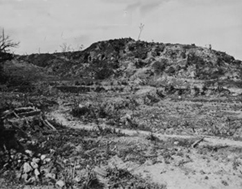 | 真嘉比南側高地(ハーフムーン)を南西側から見た写真。 草木のほとんどない荒れ果てた写真から戦闘直後の写真であると思われる。 戦闘については前述の 「真嘉比南側高地(ハーフムーン)の戦闘」 で記述しているとおりであるが、5月31日の日本軍の南部撤退開始まで日本軍が死守した丘である。 この丘は北側斜面(米軍側)は比較的緩やかな勾配で、戦車も頂上近くまで進出できるが、その稜線を越えて南側は斜度のきつい斜面であって戦車の通過は不可能であった。 日本軍はこの地形を利用して南側斜面(日本軍側)に陣地を構築して、稜線を越えて接近する米軍歩兵をことごとく撃退した。 この真嘉比南側高地を5月31日まで日本軍が確保出来たことで、首里地区の日本軍は西側からの米軍の包囲を阻止し、主力部隊の南部撤退を辛うじて成功させたのである。 写真の場所は、当時の写真に写る白く見える道路を米軍撮影の航空写真から割り出して、現在の地図に投影することによって撮影ポイントを割り出した。 | |
