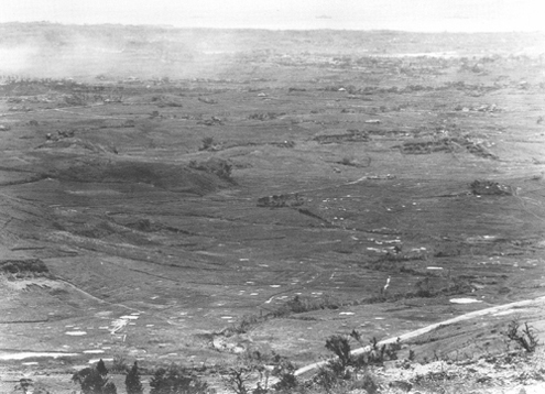 | 若干上下のアングルが異なるが、方向はほぼ一致している写真である。 この写真は首里城内の 「西のアザナ」 という展望台から撮影した。現在の写真左端にグランドが見えるのが那覇市立松城中学校で、遠方の太陽の光が当たっている場所が那覇市壺屋付近である。当時の写真の中央左に盛り上がる場所が現在の繁田川1丁目付近となる。 場所は多少異なるが、首里城地下の沖縄第32軍司令部第4坑 (出入口でこの場所の前方下約50m付近) は、唯一那覇市が遠望できる場所であり、司令官他が外の空気を吸うために訪れた際に那覇の風景を見て心を和ませたという。その時に目にした風景がこの当時の写真の風景であったことであろう。 沖縄戦を考えるとき、現在の地形や都市化された町並みの中に居ると、どうしても当時の様相が頭に浮かばない。概ね当時の沖縄はこの写真のような風景で、農村の広がるのどかで平和な島であった。 |
